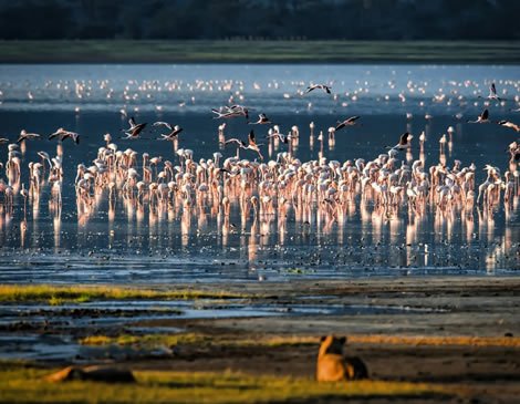 Private game drive exploring tree-climbing lions, elephants, flamingos, and more. Overnight at Escarpment Luxury Lodge.